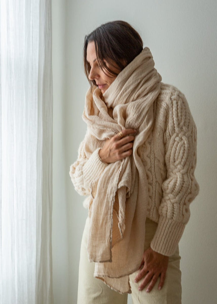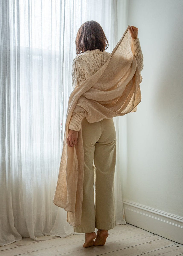This versatile hemp scarf is natural, lightweight, and sustainable. Perfect for layering year-round, it combines softness and elegance for every season. Wear draped around the shoulders or neck, naturally breathable hemp, will keep you warm in the winter but its cool touch makes it a perfect summer layer.