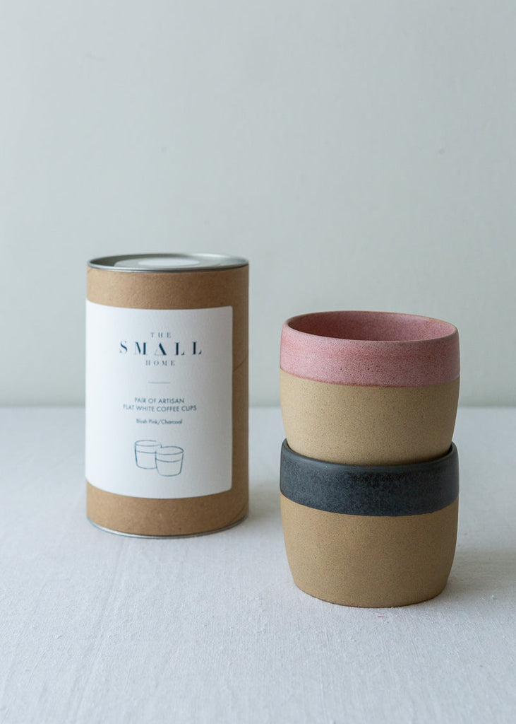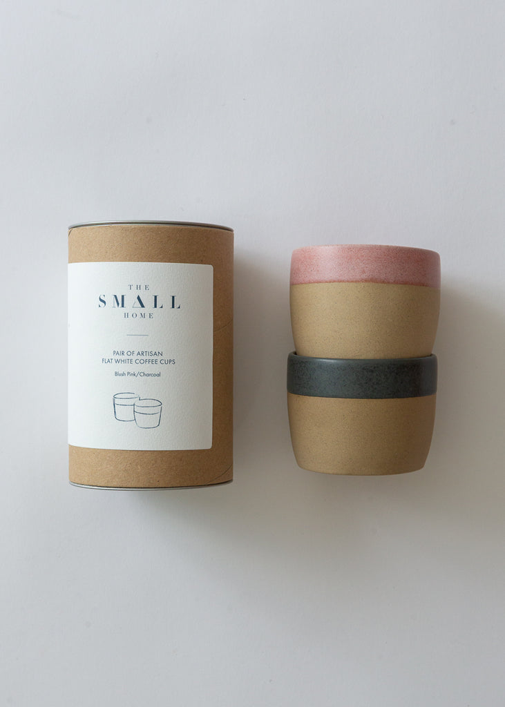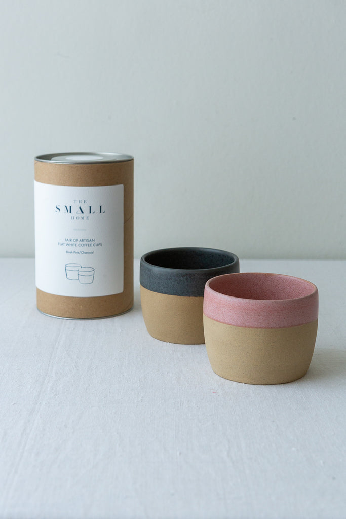Each set comes with a pair of coffee cups, one blush pink, one charcoal - a lovely gift for a coffee lover.