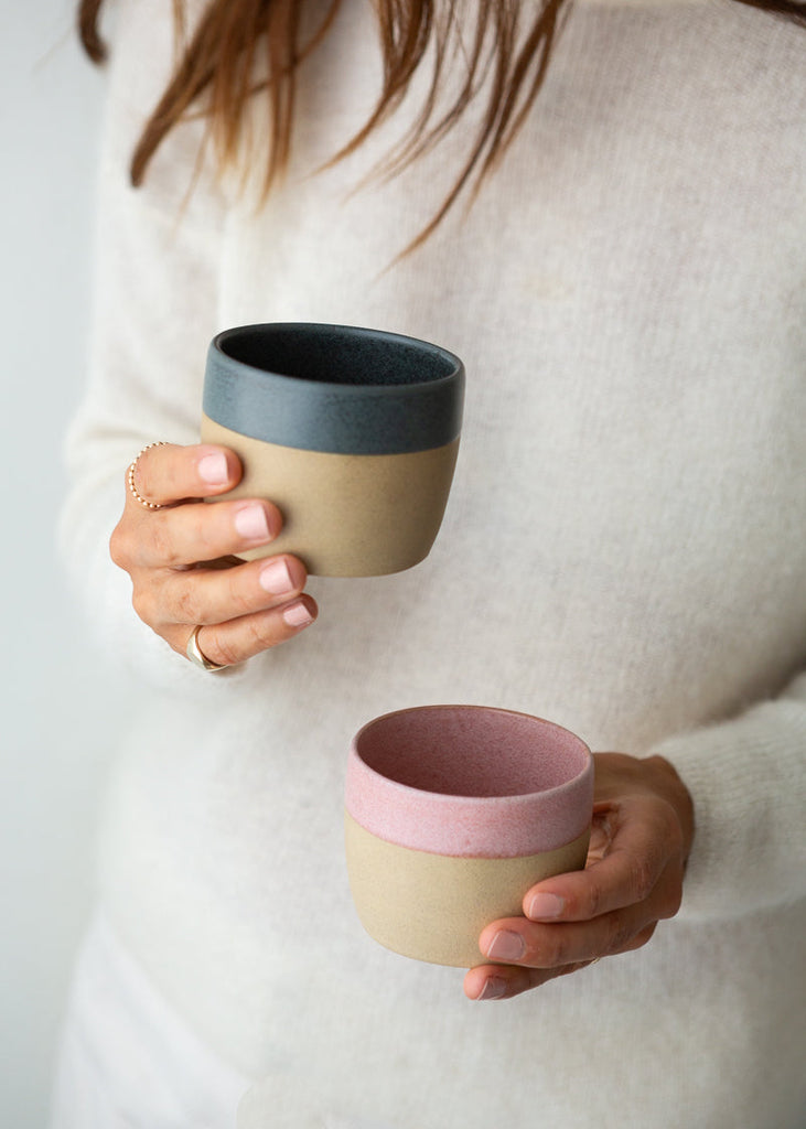 Made in Portugal sustainably crafted from recycled clay stoneware dishwasher proof smooth matte speckled glaze on the cup interior and part of the exterior remaining part of the exterior unglazed H 6.6cm D 8.7cm 0.20L Available in 3 colours: Blush Pink, Ivory and Charcoal.