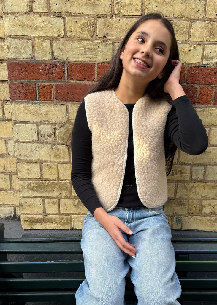 Cosy and breathable, this children’s merino wool gilet is made from 100% soft, non-itchy Woolmark merino wool in a natural cream shade. Featuring a teddy-textured fabric, concealed inner wooden button fastening, and blanket stitch detail – the perfect layering piece for little ones.