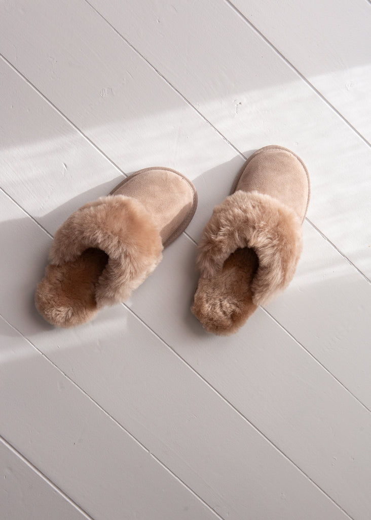Luxurious slip-on sheepskin slippers in a soft pale caramel colour. With comfortable sheepskin insoles and waterproof rubber soles.